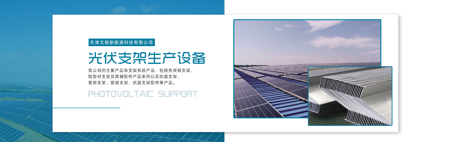 天津文程新能源科技有限公司成立于2021年,是專注于集中式、分布式、漁光互補和農光互補等清潔能源發電的綜合性企業 公司是集設計、研發、生產、制造為一體的綜合型企業。公司占地面積20000平方米,注冊資金5000萬元整。公司坐落于華北鋼鐵重鎮--大邱莊,距天津市區50公里、鄰104和205國道及京滬高速,交通十分便捷。 本公司擁有三個生產車間,其中兩個冷彎型鋼車間,一個鋅鋁鎂型鋼車間,擁有自動冷彎成型機10條,自動數控沖孔機10條以及焊接加工等設備。主要生產產品有:太陽能光伏支架、各種規格的C/Z/U型鋼、抗震支架、管廊支架及整套配件等。